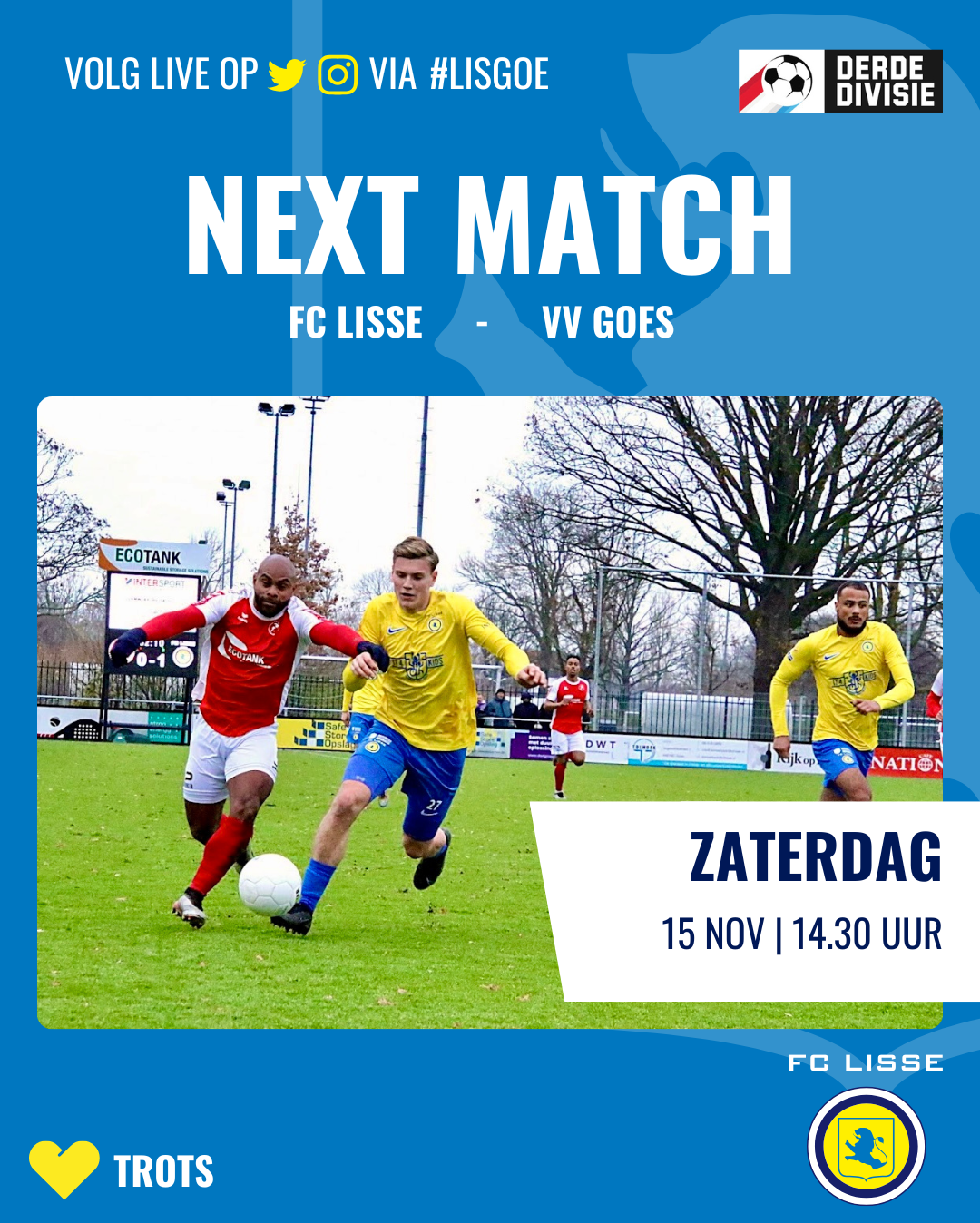 Gezien de stand op de ranglijst is het zaterdag 8 november 2025 voor zowel VVSB als FC Lisse aan- dan wel voorlopig afhaken als het gaat om de topposities in de derde divisie B. Er moet gewonnen worden. Aan een gelijkspel hebben de twee teams helemaal niets. De aftrap is om half vier. FC Lisse-supporters steun de spelers van het eerste team. Laat de Lisserse leeuw niet in zijn hempie staan.