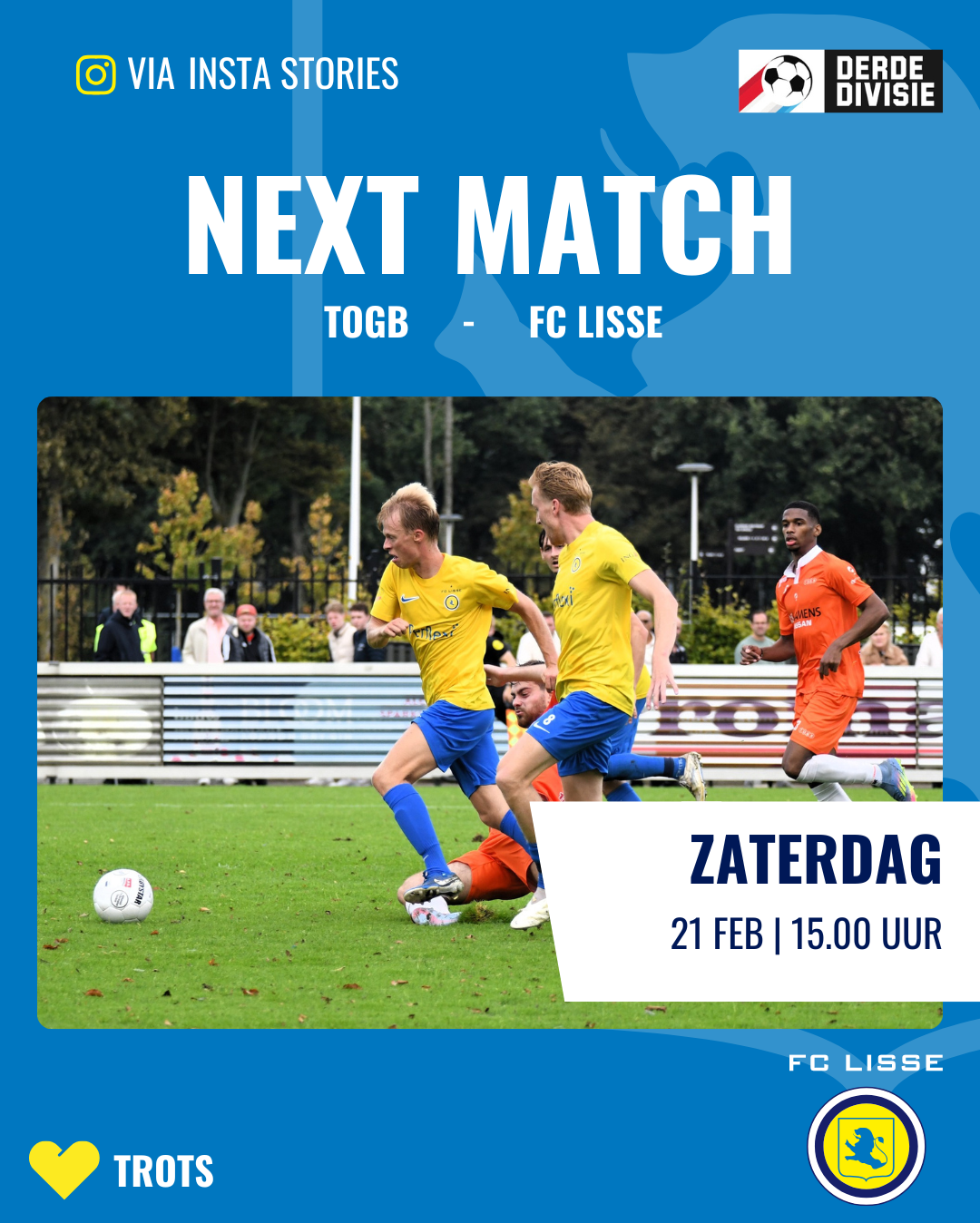 Stijlvol winnen tegen Kloetinge. Met bloed, zweet en tranen winnen van Zwaluwen Vlaardingen. Het maakt allemaal niet uit. Lelijk of mooi winnen levert gewoon iedere wedstrijd drie punten op. Het zijn de resultaten die tellen. FC Lisse zit in een flow. In een gevoel van de niet te kloppen ploeg. Maar even vast houden dit gevoel. In ieder geval op zaterdag 21 februari 2026. Op Sportpark Het Hoge Land in Berkel en Rodenrijs. Vanaf drie uur is TOGB de tegenstander voor de mannen van trainer Leen van Steensel. Inzet vormt het behalen van de tweede periodetitel in de derde divisie B. Een prijs die de zekerheid geeft voor het spelen van de nacompetitie met als inzet een plek in de tweede divisie.
