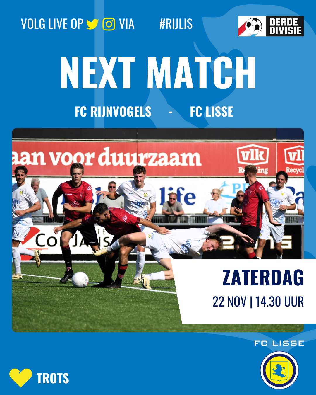 FC Lisse zal ongetwijfeld geleerd hebben van de eerste helft vorig seizoen bij FC Rijnvogels. Dat betekent in ieder geval vanaf begin er bovenop klappen. De voetbalkwaliteiten komen vervolgens aan de oppervlakte. FC Rijnvogels wil blijven aanhaken bij koploper Kloetinge en FC Lisse wil door met de ingeslagen weg naar boven. Dat belooft wat op zaterdag 22 november 2025 in Katwijk. De aftrap is om half drie.