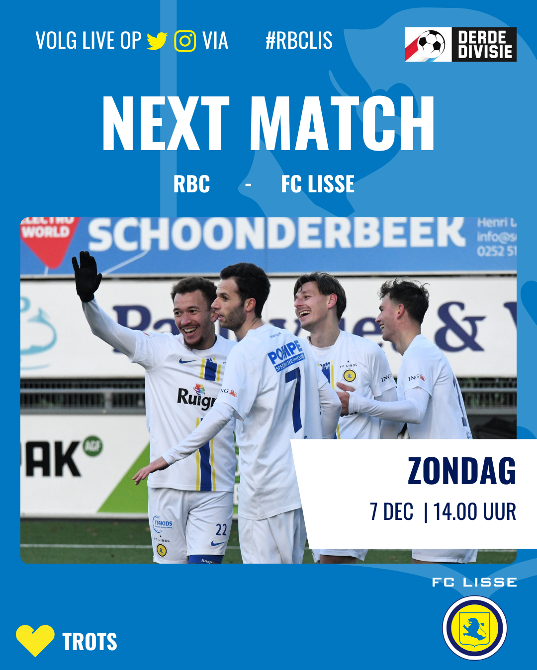 Zowel FC Lisse als RBC wisten tot op heden dertig keer te scoren. Een gemiddelde van precies twee per wedstrijd. Naar verwachting zal geen van de twee teams op zondag 7 december 2025 zich gaan ingraven. De aanval is immers de beste verdediging. FC Lisse heeft ondanks het puntverlies tegen UNA samen met Gemert nog steeds de koppositie in handen in de strijd om de tweede periodetitel in de derde divisie B. RBC voelt zich prettig op eigen veld. Vanaf twee uur in het Atik Stadion in Roosendaal.