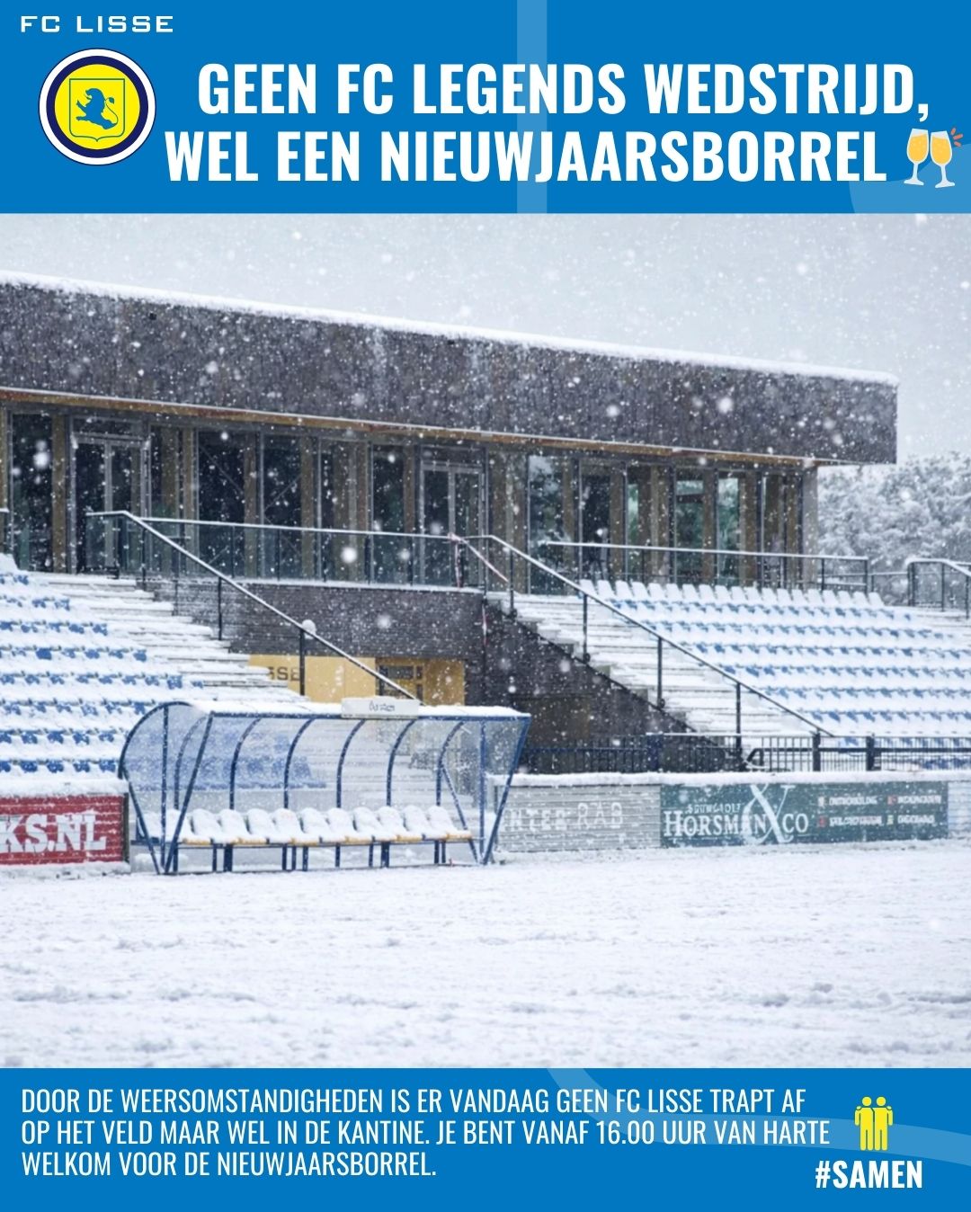 Maar wel in de kantine. Vanwege de weersomstandigheden zijn we helaas genoodzaakt de FC Lisse Legends wedstrijd te cancelen. Wel ben je van harte welkom in onze kantine. Vanaf 16.00 uur vindt dan onze Nieuwjaarsborrel plaats๐ฅ