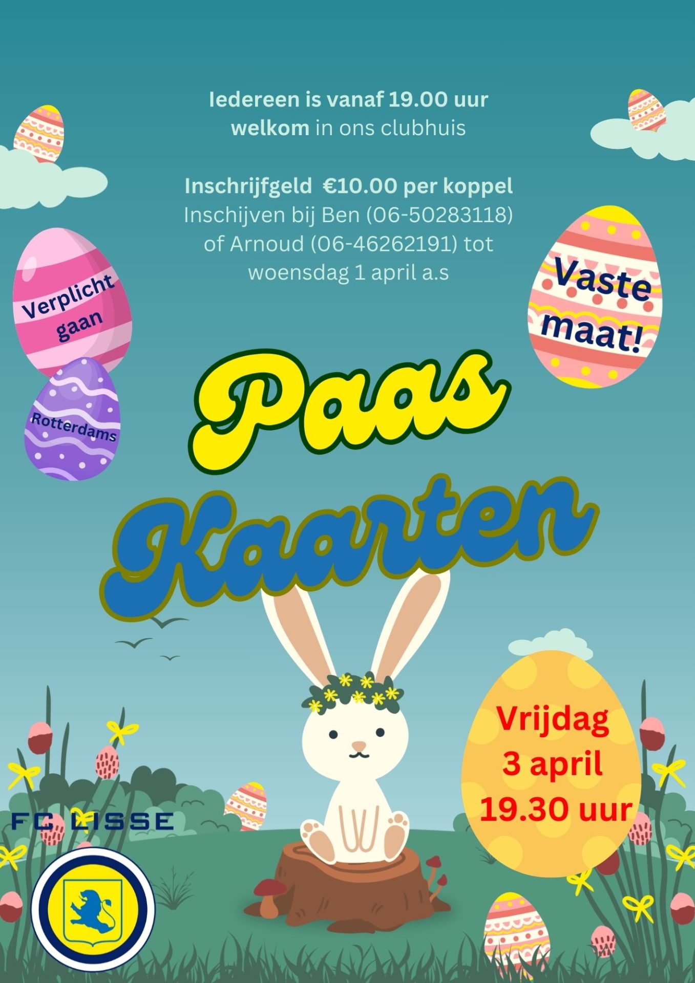 Inschrijven vooraf tot uiterlijk woensdag 1 april a.s. via Ben Kortekaas (06-50283118) of Arnoud Kool (06-46262191). Per mail kan ook via facilitair@fclisse.nl