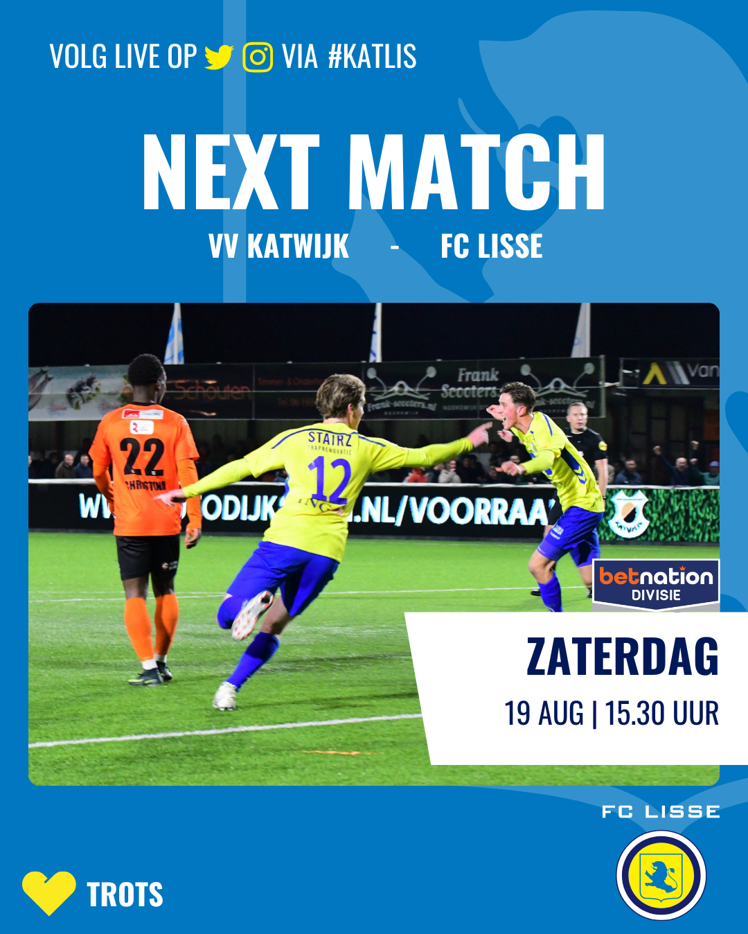 De eerste Bollenderby van het seizoen is zaterdag 19 augustus dus Katwijk – FC Lisse. Kunnen de geel-blauwen wederom stunten of zet Katwijk de toon voor een nieuw succesvol seizoen. De aftrap op De Krom is om half vier.